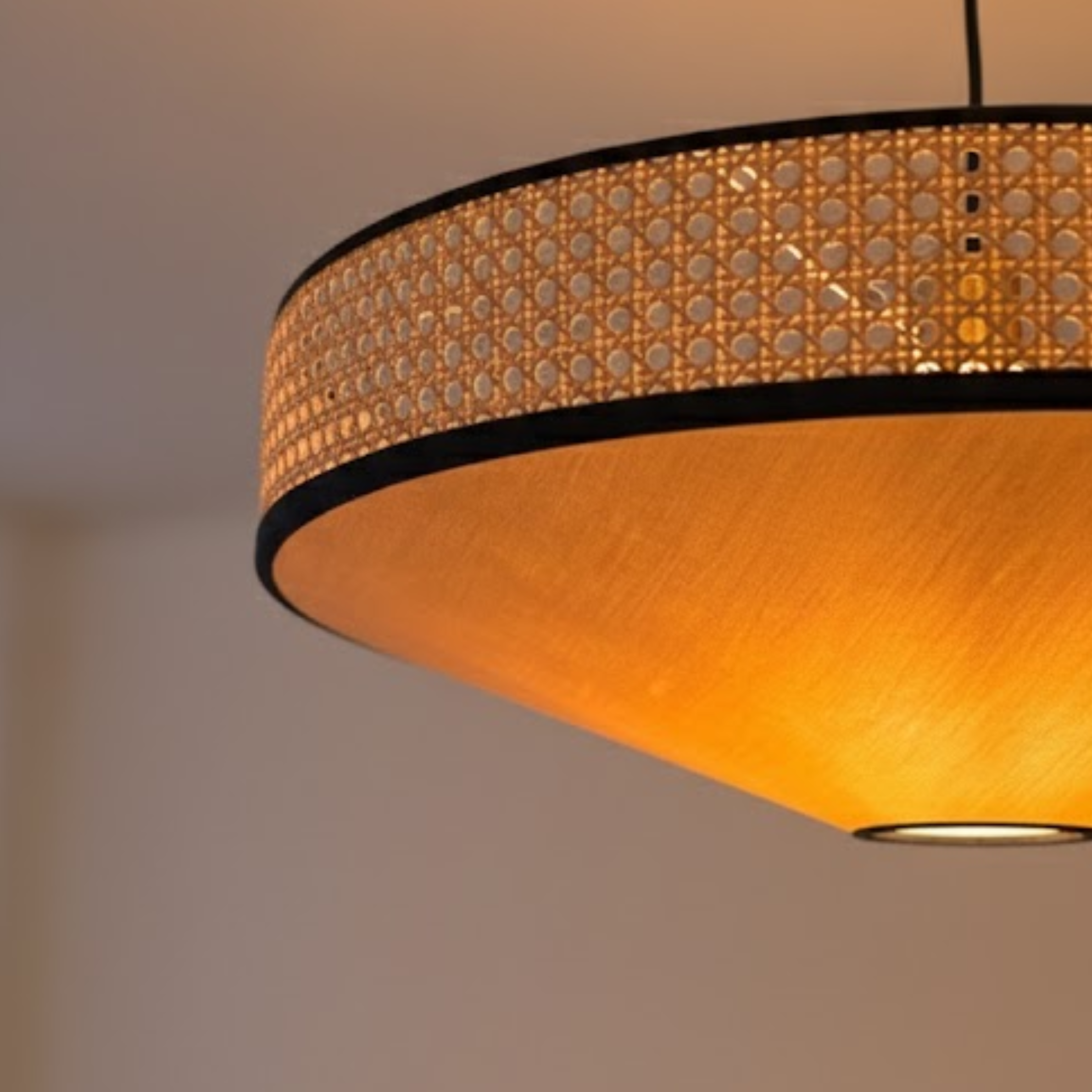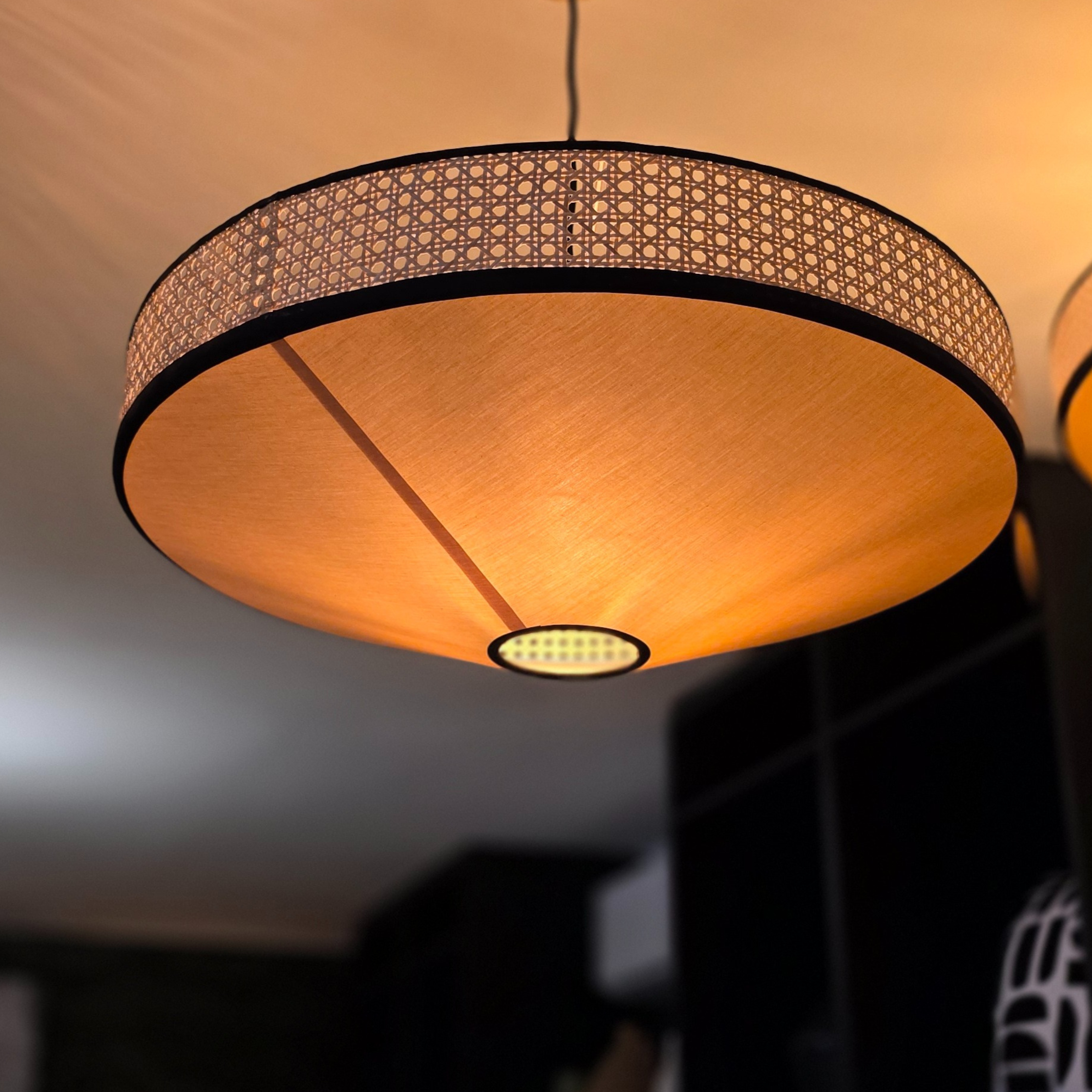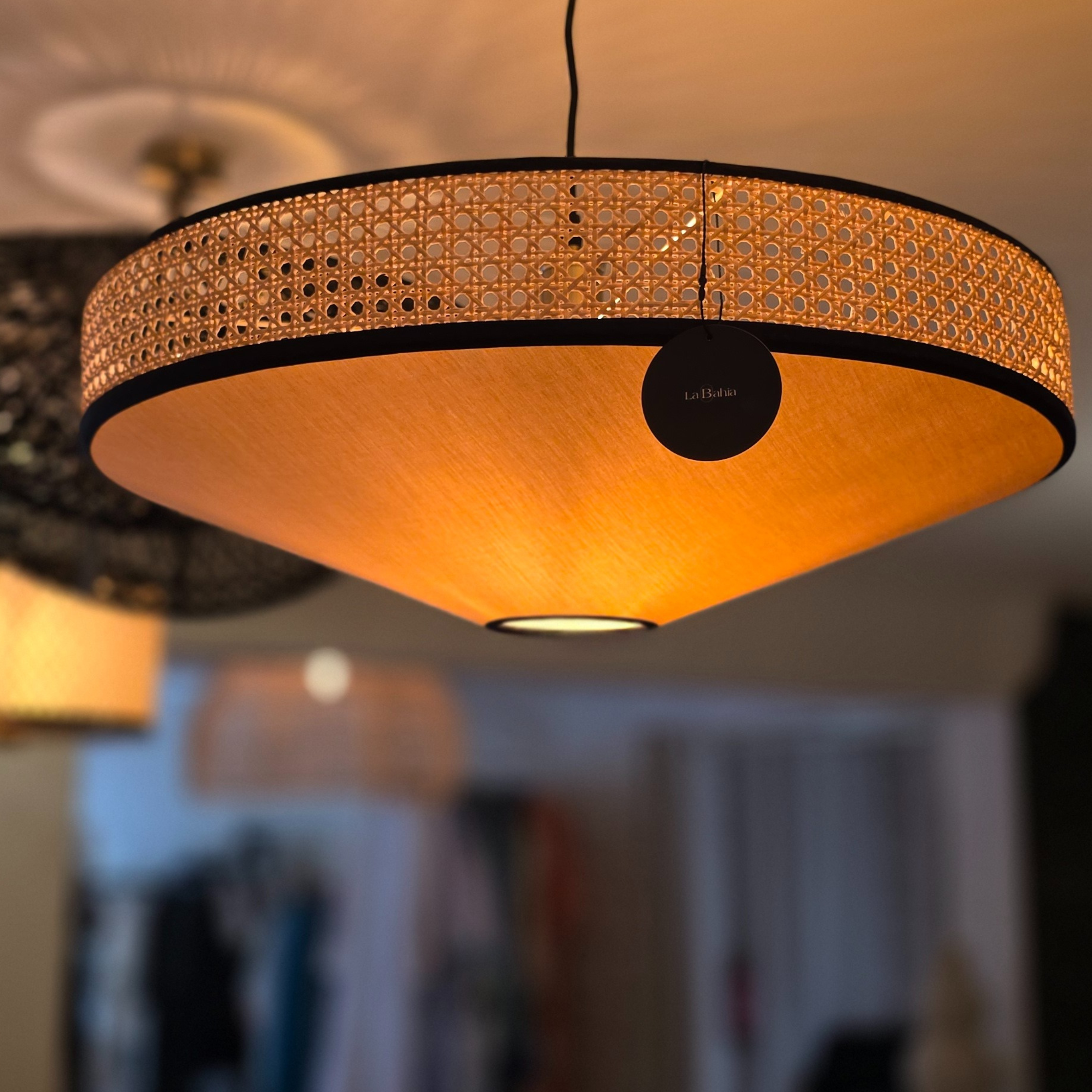 Cette suspension au design unique est entourée d’un cannage fin filtrant la lumière pour une atmosphère chaleureuse.