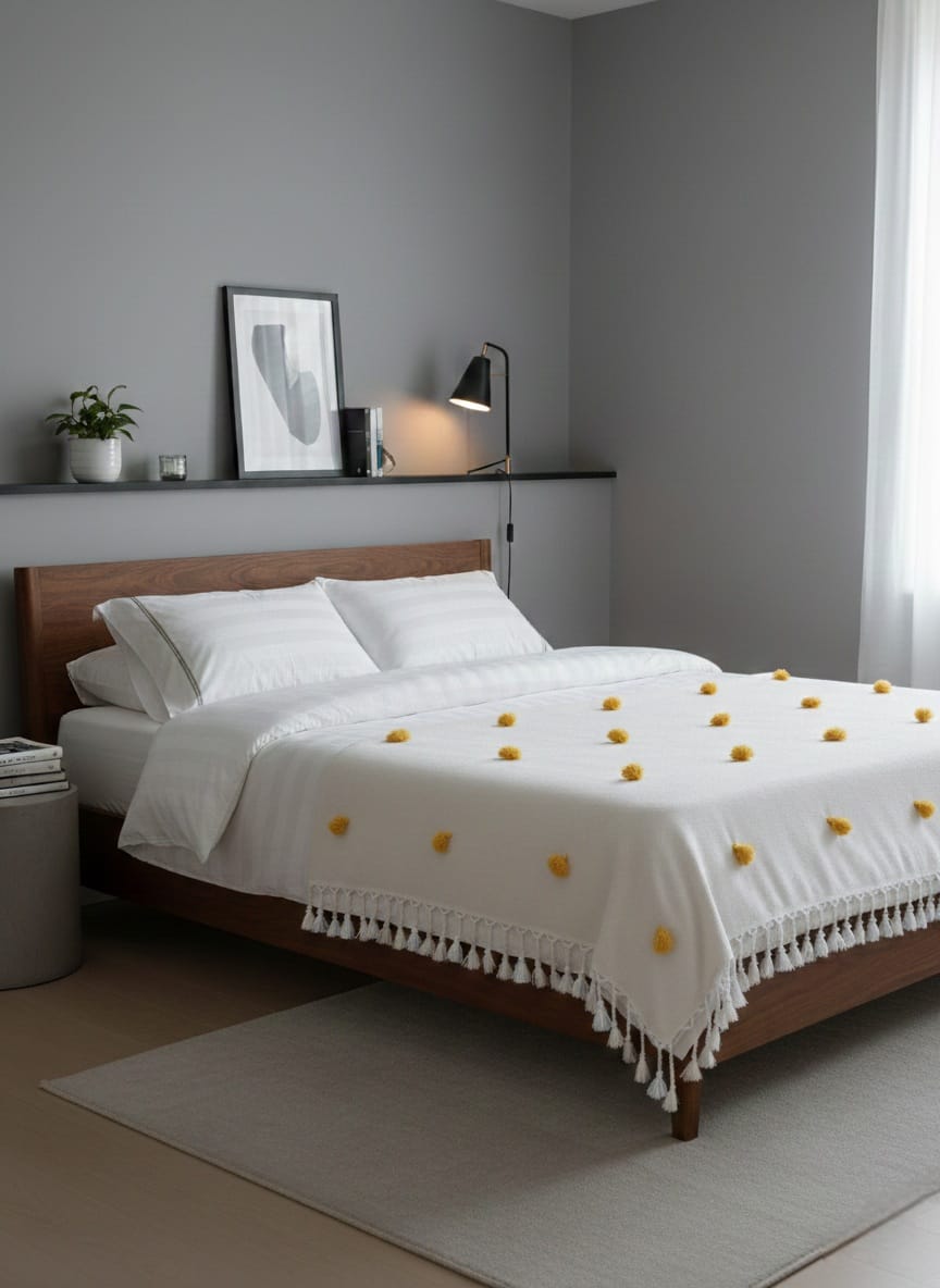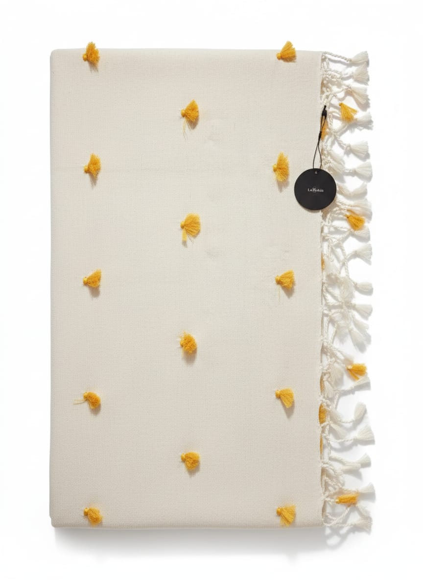 Ce couvre-lit parsemé de petits pompons couleur oranger donnera un brin de fraîcheur à votre chambre à coucher. Convient pour lit de 140 et 160.