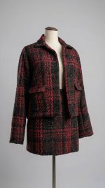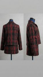 Ensemble veste et jupe en tweed texturé. Motif carreaux rouge profond sur fond noir. Coupe droite, poche à rabat, jupe coordonnée. Une silhouette chic et moderne pour l’hiver