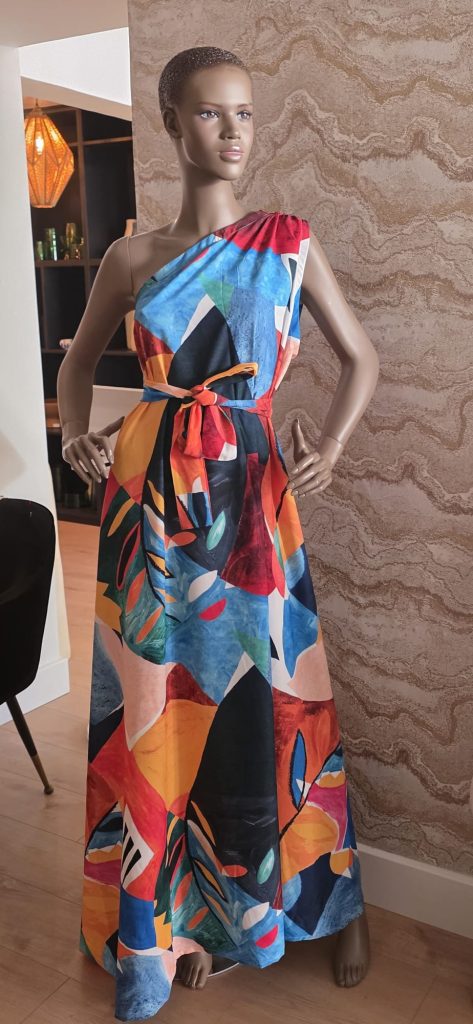 Robe longue asymétrique, coton et polyester., aux couleurs vibrantes. Avec sa coupe One Shoulder et sa ceinture à nouer, elle met en valeur votre silhouette. Taille unique.