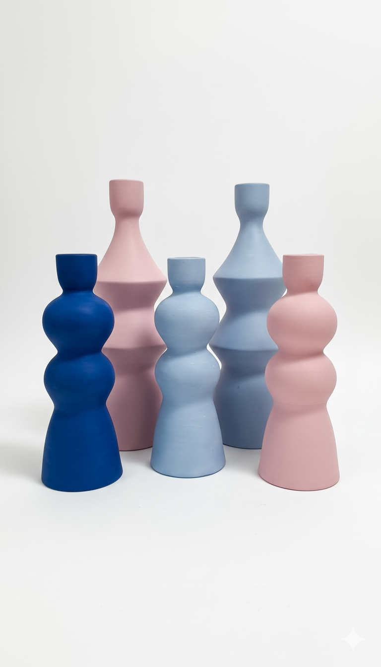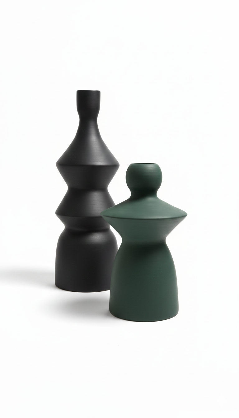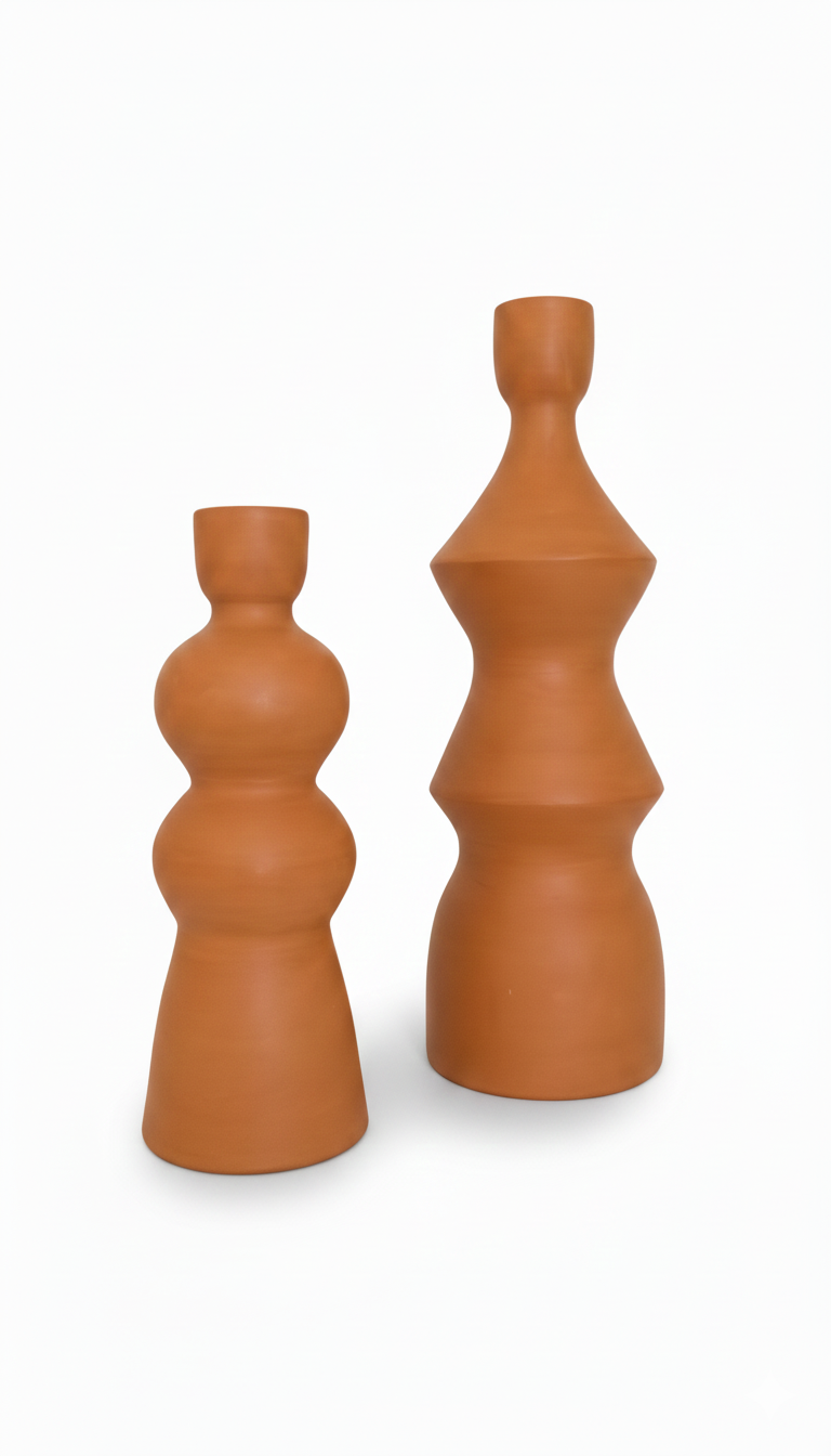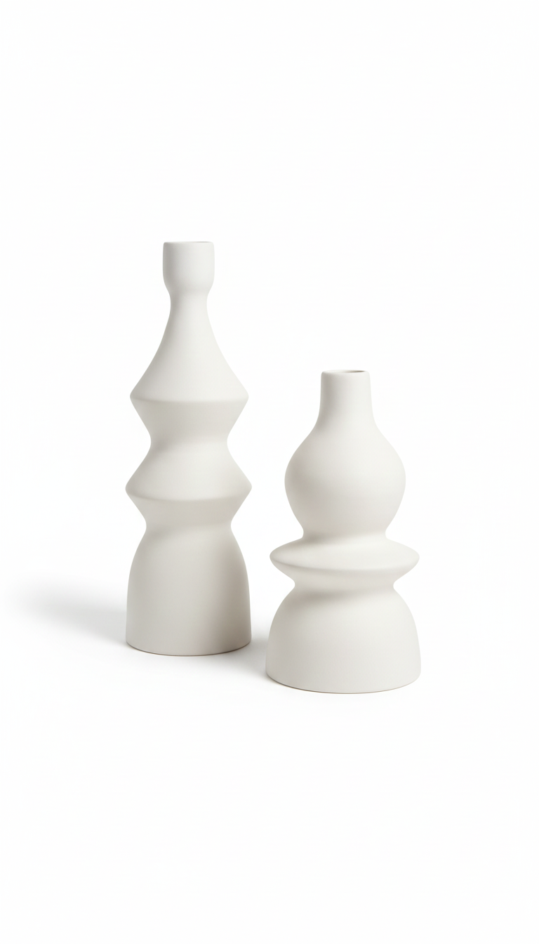 À la fois totem décoratif et bougeoir, il structure l’espace par sa présence et révèle la matière par sa finition mate et minérale.