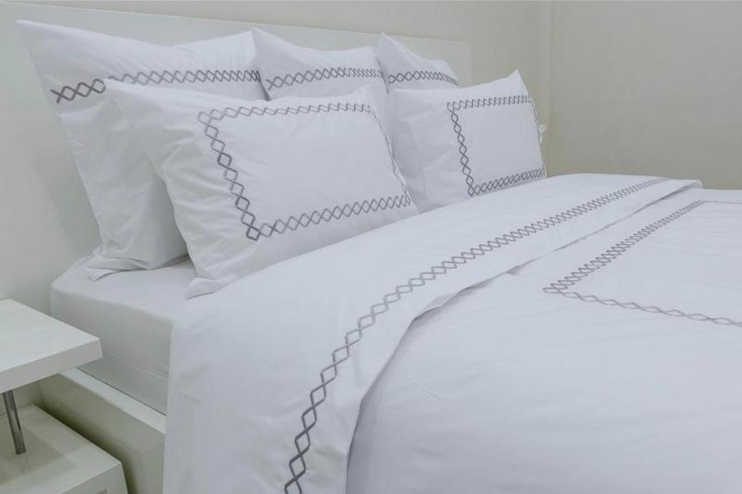 Housse de couette aux losanges argentés, en percale de coton 200 TC. Brodée à la main. Facile à mettre. Fermeture avec de petits liens cousus à l’intérieur. 240 x 220 pour lit de 160